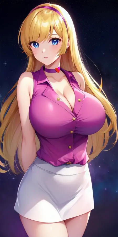 • pink_collared_shirt_cleavage_sleeveless_buttons_white_pencil_skirt_heart_choker_arm_ribbon:她的“新切蒂·蜂蜜”服装。