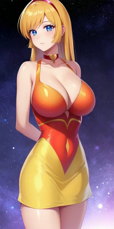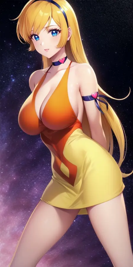 • sleeveless_wing_collar_short_dress_heart_choker_arm_ribbon_orange_dress_yellow_dress:她蓝色连衣裙的橙黄配色变体。