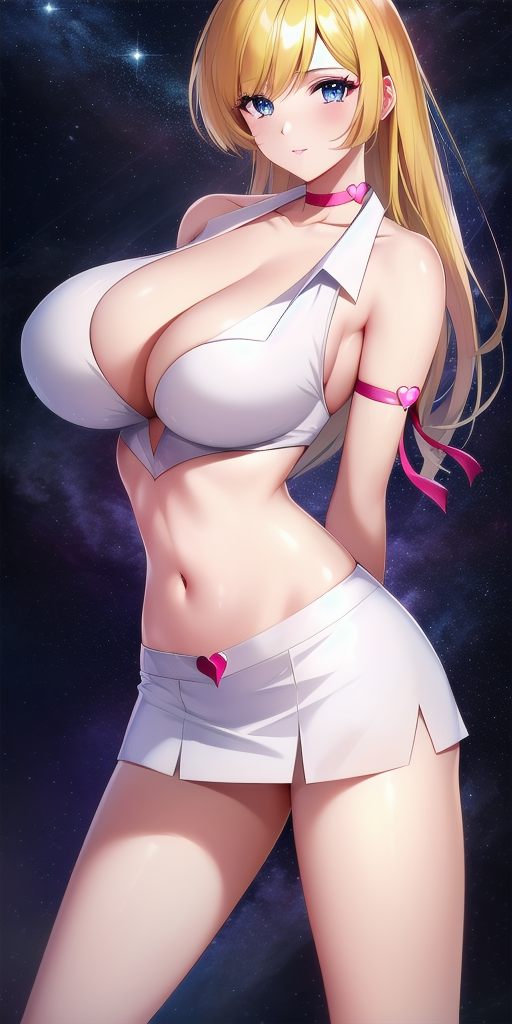 • white_crop_top_cleavage_wing_collar_halterneck_midriff_white_microskirt_thighs_heart_choker_arm_ribbon:两件式白色服装,我认为这来自更现代的蜂蜜形象。
