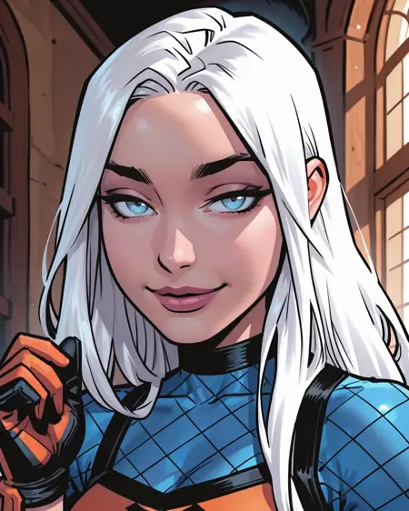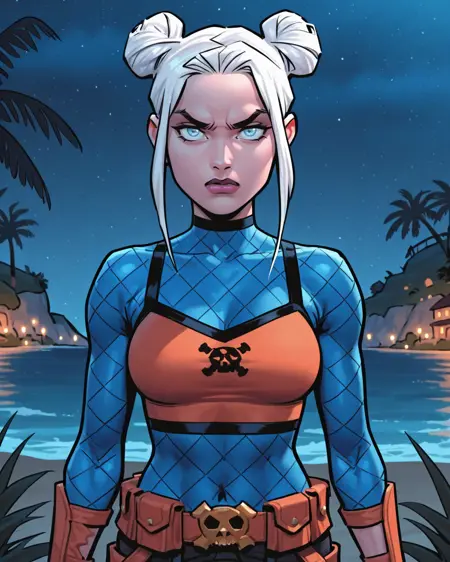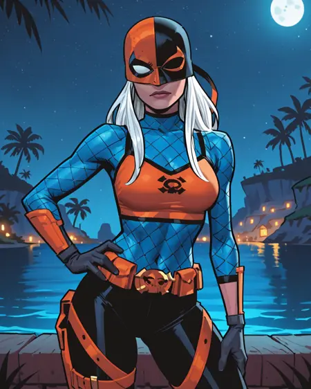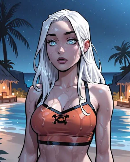 Triggers: rosewilson, bodysuit, white hair, long hair, crop top, gloves, belt, mask, no pupils
