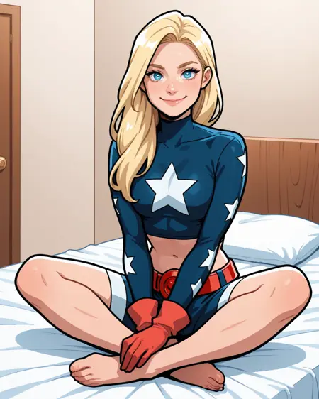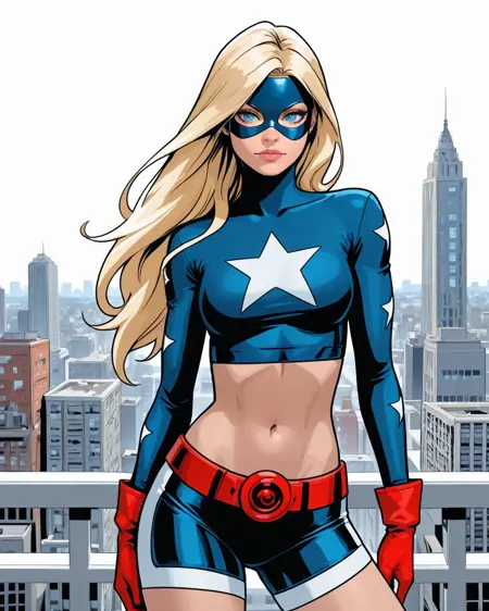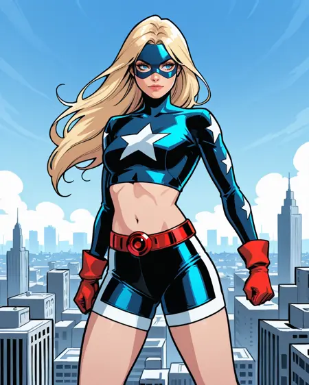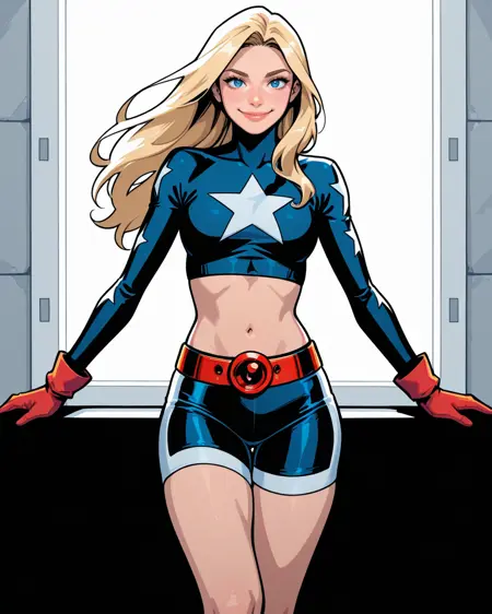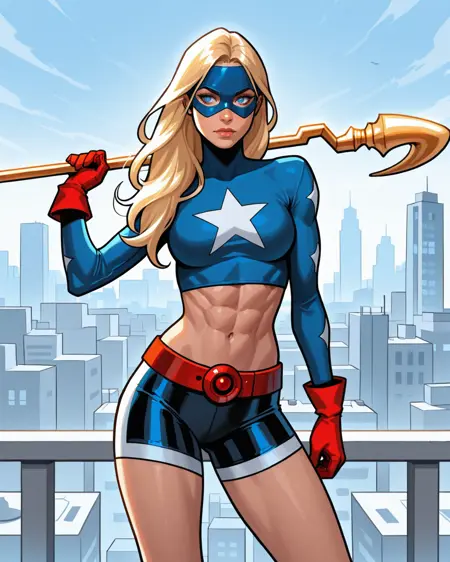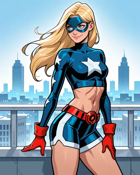 触发词:courtneyw, 金发, 长发, 蓝眼睛, 露脐上衣, 有肌肉, 露腹, 短裤, 皮带, 手套, 面具