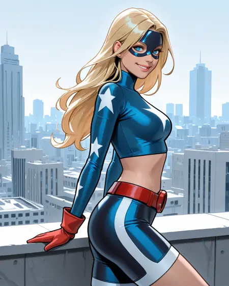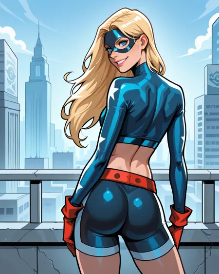 触发词:courtneyw, 金发, 长发, 蓝眼睛, 露脐上衣, 露腹, 短裤, 皮带, 手套, 面具