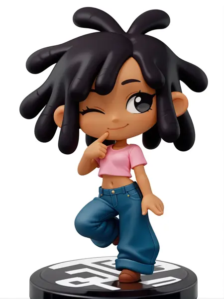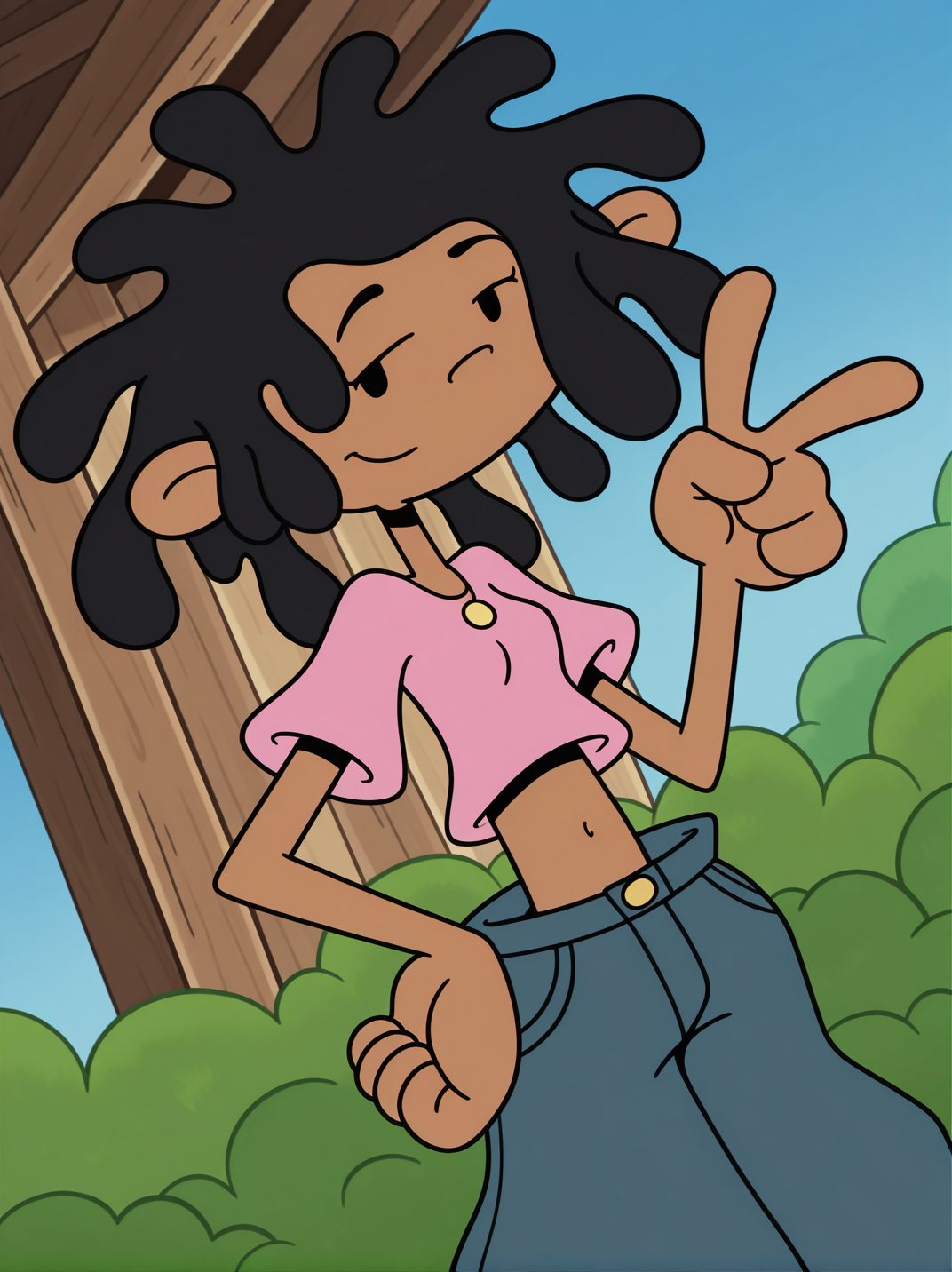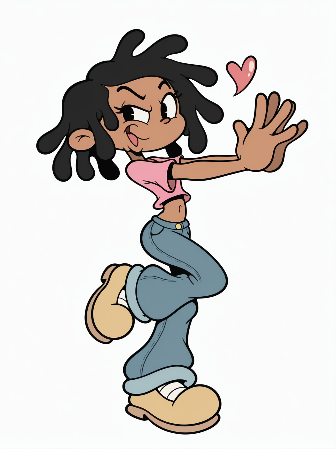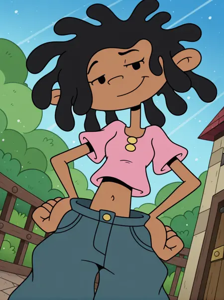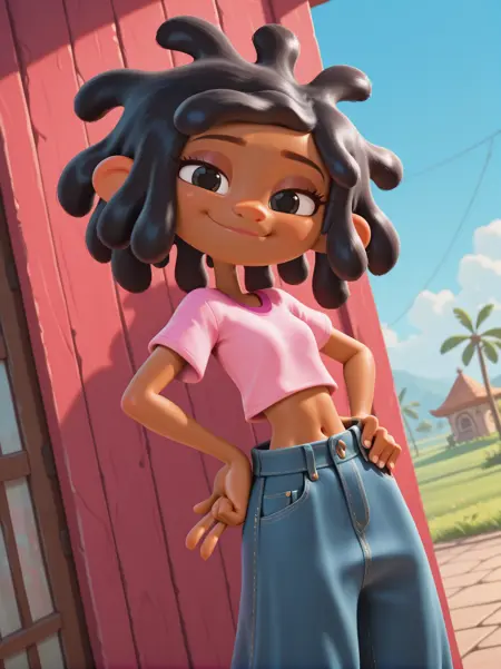 주 프롬프트: "검은 피부, 분홍색 셔츠, 허리 노출, 짧은 소매, 넓은 바지, 청바지, 검은 머리, 락스타일, 검은 눈"