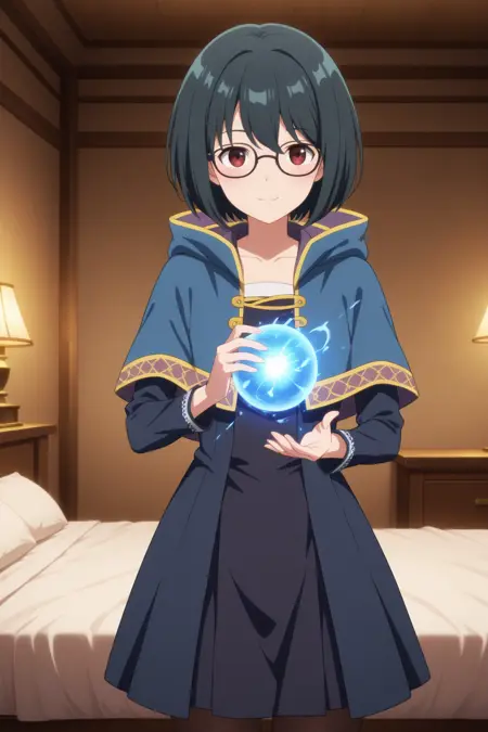 aaeri, red eyes, black hair, glasses, black-framed eyewear, black dress, blue capelet, gold trim, pantyhose, anime coloring,