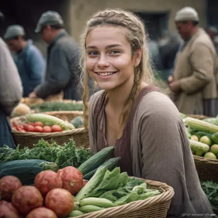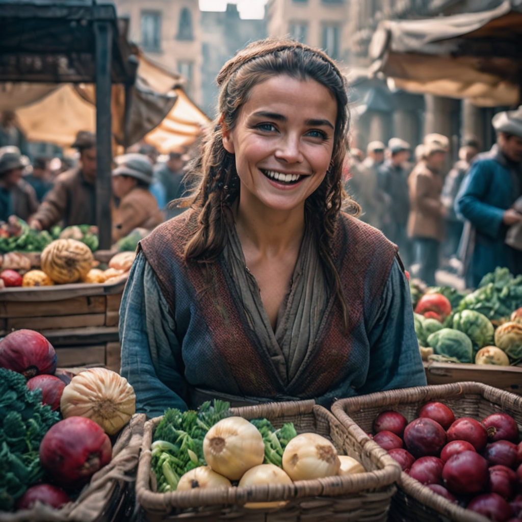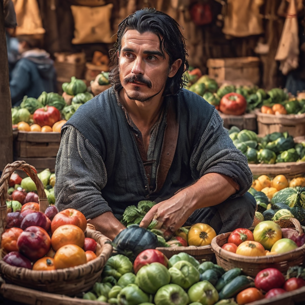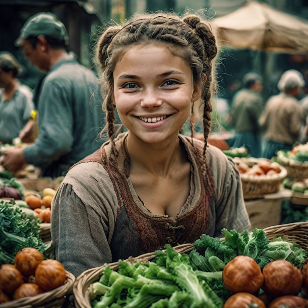 1boy, 1girl, apple, basket, beard, black hair, black headwear, blue eyes, blurry, blurry background, bracelet, braid, bread, breasts, brown eyes, brown hair, brown headwear, brown vest, carrot, cleavage, closed mouth, corn, depth of field, facial hair, fine art parody, food, fruit, grey hair, grin, hat, holding, holding basket, indoors, jewelry, knife, long hair, long sleeves, looking at viewer, male focus, mole, multiple boys, mustache, necktie, old, old man, old woman, onion, outdoors, potato, radish, realistic, robe, salad, scarf, shirt, short hair, single braid, smile, solo, solo focus, stubble, teeth, upper body, vegetable, vendor (grocer), vest, white hair