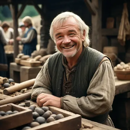 1boy, 1girl, 2boys, 6+boys, bald, bare shoulders, basket, beard, black hair, blonde hair, blue eyes, blurry, blurry background, bowl, box, braid, breasts, brown eyes, brown hair, brown headwear, burlap, cake, candle, cape, chainmail, chisel, cleavage, closed eyes, closed mouth, coin, dark skin, depth of field, dirty, facial hair, facing viewer, fine art parody, food, freckles, gloves, green eyes, grey hair, grin, hat, indoors, jewelry, lamp, lips, long hair, long sleeves, looking at viewer, male focus, manly, multiple boys, multiple girls, mustache, nail polish, necklace, off shoulder, old, old man, one eye closed, onigiri, own hands together, parted lips, photo background, photo inset, realistic, ring, robe, scar, scar on face, shirt, short hair, sitting, sleeves rolled up, smile, smoke, solo, solo focus, stone wall, stones, stubble, table, tools, upper body, vendor (materials), vest, white hair, wood pile, workbench, wrinkled skin