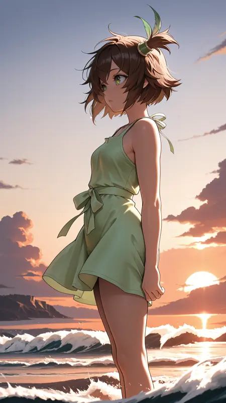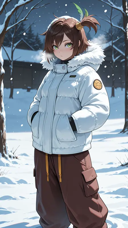 short hair, brown hair, side ponytail, hair tube, hair feather, green eyes, black top, sleeveless, jacket off shoulder, pink jacket, brown jacket, long jacket, multicolored jacket, brown gloves, fingerless gloves, black pants,