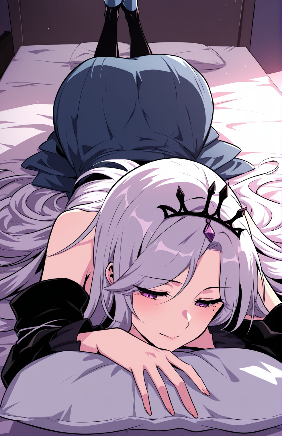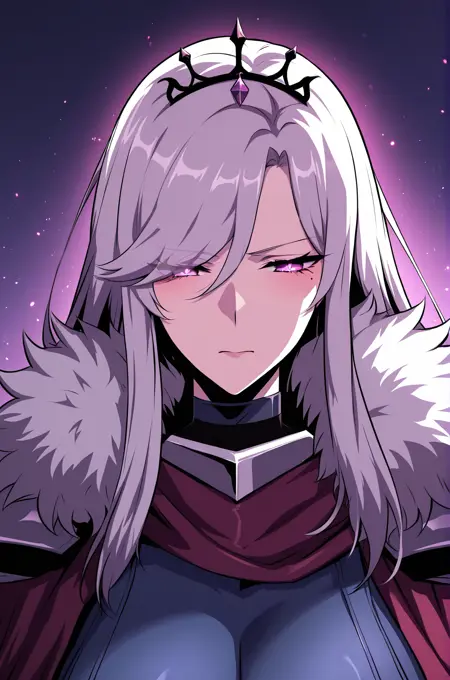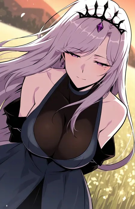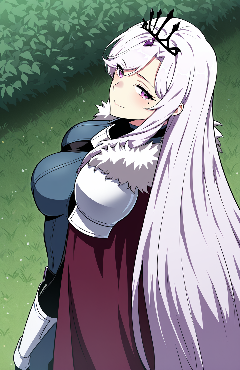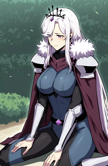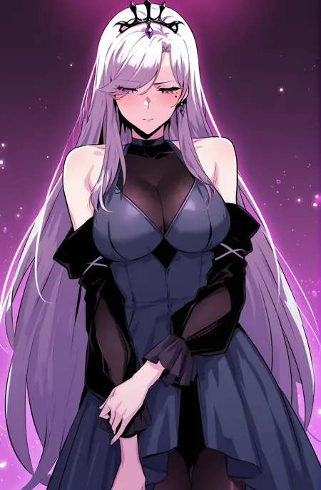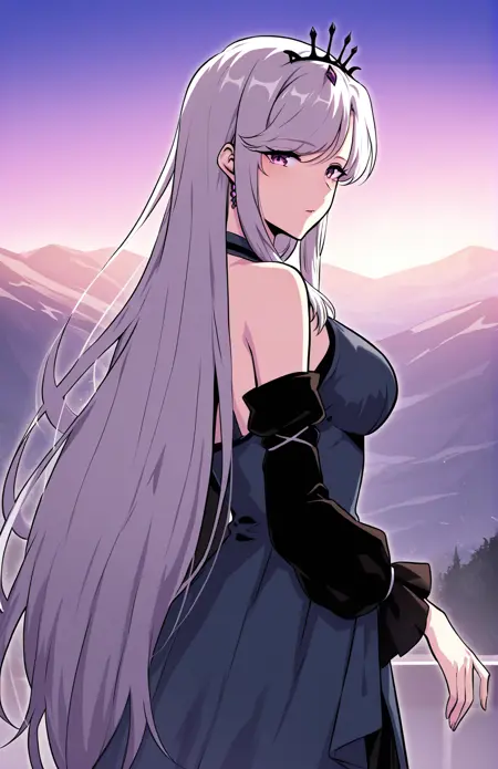 | 训练词汇 | 1 girl, solo, very long hair, white hair, hair over one eye, purple eyes, mole under eye, crown, gemstone crown, side bangs,已复制! spero_dress, black dress, halter neck, sleeveless, off shoulder sleeves, detached sleeves, long sleeves, ruffled sleeves, blue bow, high slit skirt, black tights, high heels, purple shoes已复制! spero_commander, battle outfit, blue bodysuit, high collar, white cuffs, shoulder armor, dark belt, purple gem belt buckle, long sleeves, arm armor, form-fitting suit, long cape, dark red cape, fur trim cape, fur collar (on cape), cape with shoulder pads已复制! |