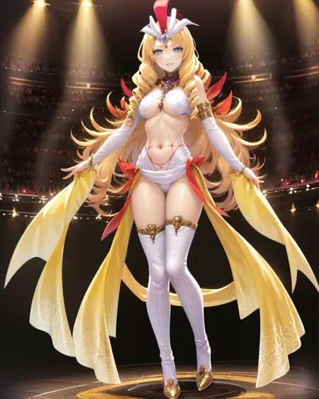 white headdress,  tiara, yellow ribbons, long sleeves, white dancer outfit, white thighhigh boots, jewelry, bangle,