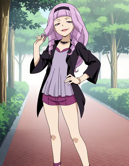 기본 옷차림 프롬프트: 마스터피스, 최고 품질, 놀라운 품질, 애니메이션 스크린캡, 1girl, solo, rinhashi, 검은 헤어밴드, 목걸이, 검은 카디건, 민소매 셔츠, 보라색 셔츠, 짧은 반바지, 보라색 반바지, 보라색 신발, 스트랩 힐, 팔찌