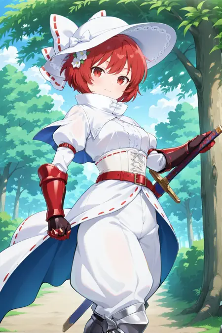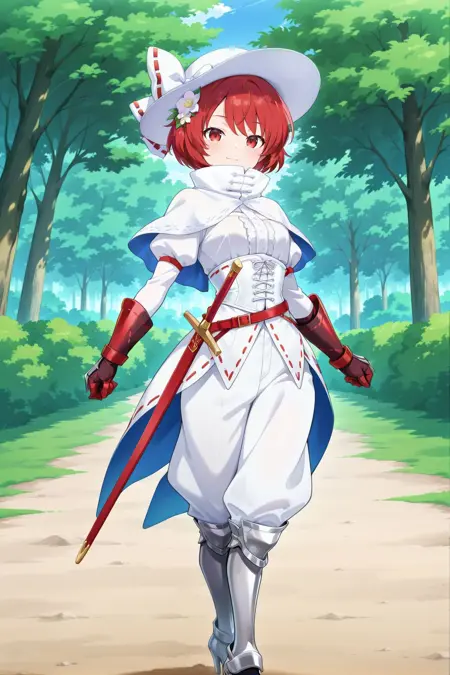 sekibanki, 1girl, solo, red eyes, red hair, short hair,, sekibanki \(white dullahan under the willow tree\), alternate costume, white hat, hat bow, white bow, ribbon-trimmed bow, hair flower, white capelet, high collar, white collar, white dress, ribbon-trimmed dress, juliet sleeves, long sleeves, armored gloves, red gloves, white corset, red belt, white waist cape, white pants, puffy pants, armored boots, high heels, sword, estoc,