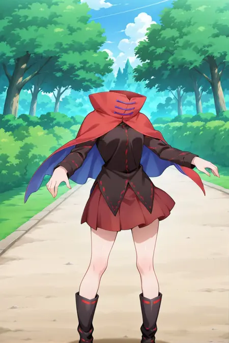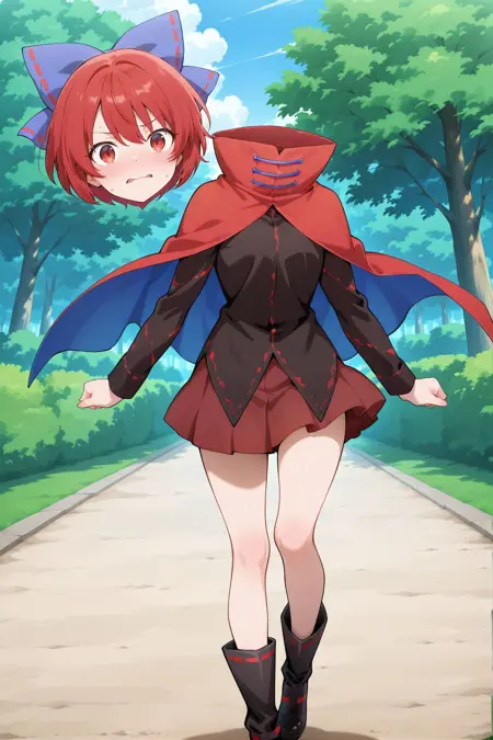 hair bow, blue bow, red cape, black shirt, long sleeves, red skirt,miniskirt, black boots,