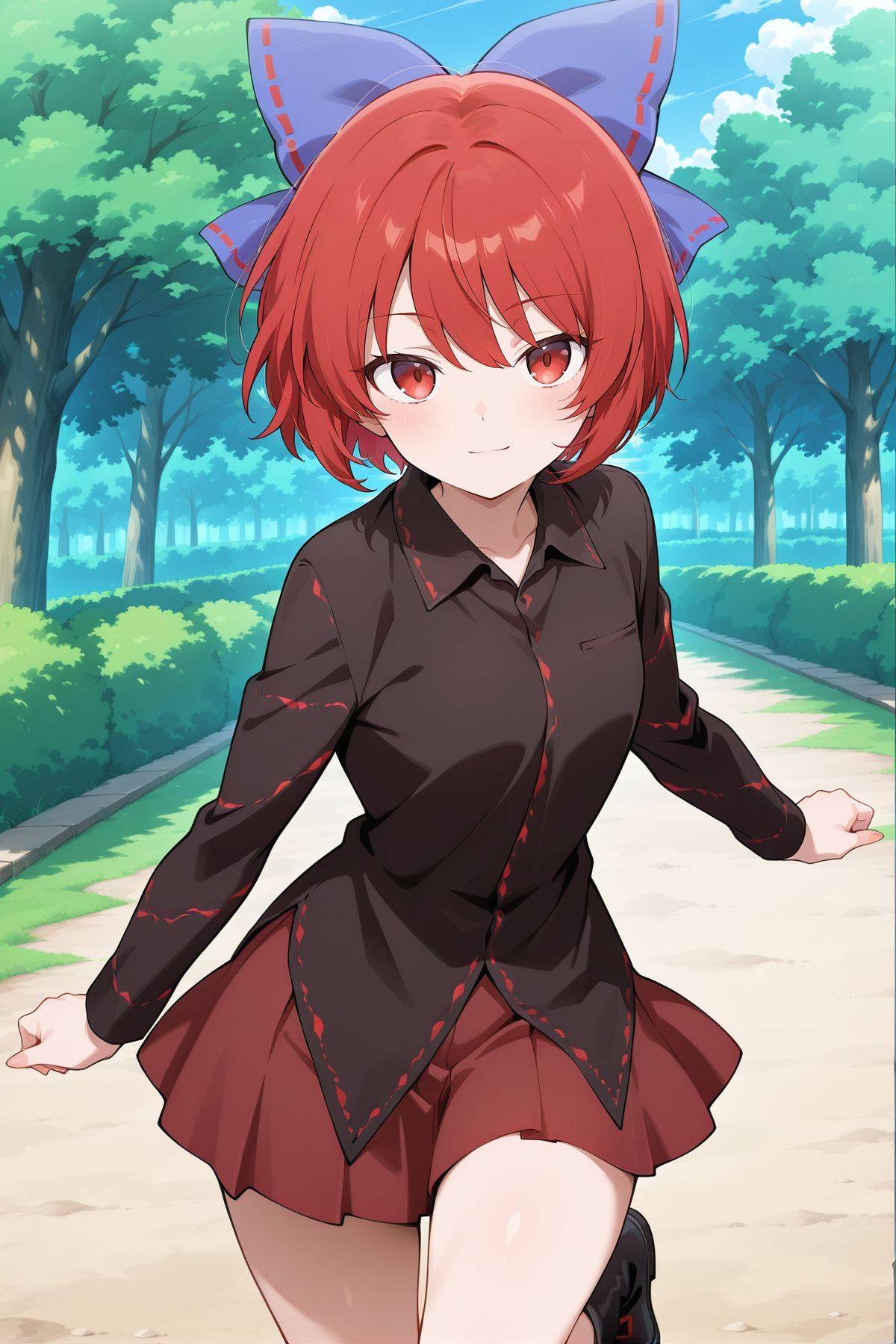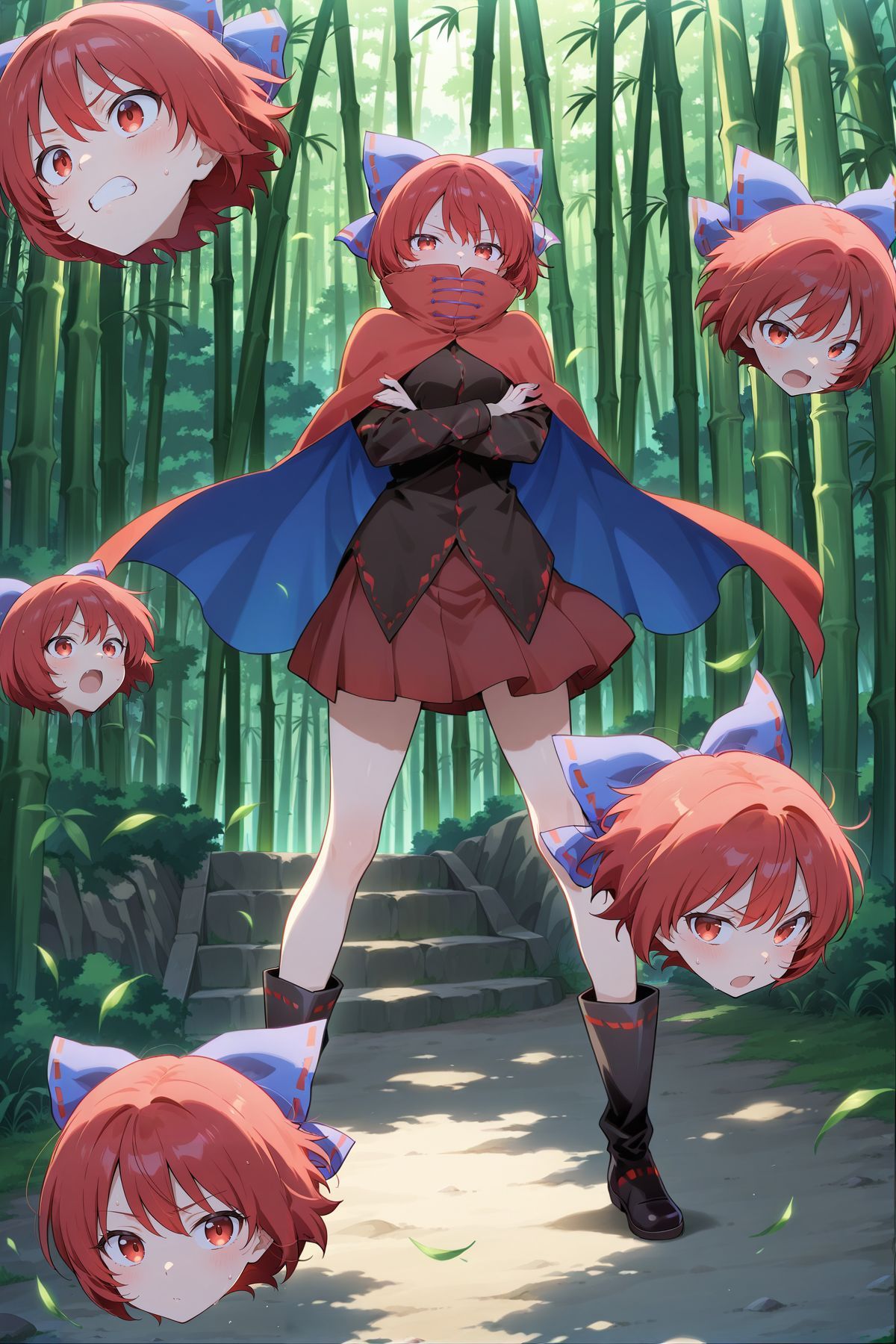 hair bow, blue bow, red cape, high collar, black shirt, ribbon-trimmed shirt, long sleeves, red skirt, black boots,