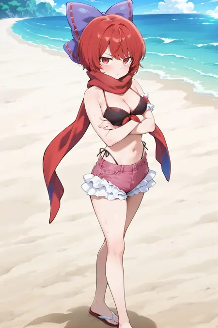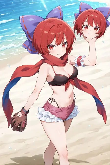 sekibanki, 1girl, solo, red eyes, red hair, short hair, medium breasts,, sekibanki \(dullahan on the beach\), alternate costume, purple bow, hair bow, ribbon-trimmed bow, red scarf, cleavage, black bikini, ribbon-trimmed bikini, frilled bikini, armband, bikini under shorts, denim shorts, pink shorts, frilled shorts, red sandals, flip-flops, baseball mitt,