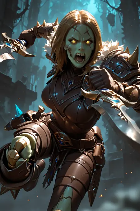 触发词“Rogue”:LilVoss,灰皮肤,僵尸,彩色皮肤,亡灵,长发,中分发型,关节,发光的眼睛,棕色肩甲,缝合线,上衣,棕色护臂,棕色手套,尖刺,鞋子,毛皮镶边,棕色胯部帘布,棕色裤子,缝合的嘴,疤痕