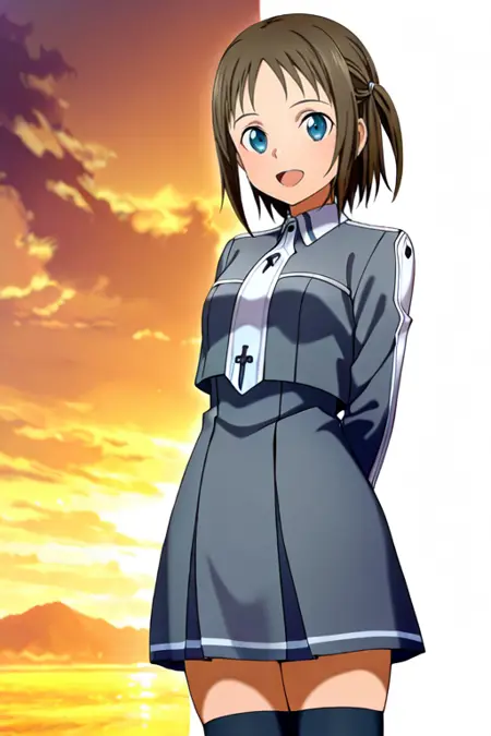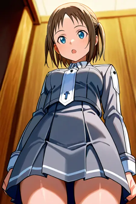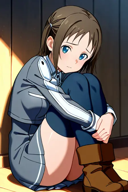 중간 크기의 가슴, ronyeDef, 긴 소매, 학교 유니폼, 회색 재킷, 넥타이, 회색 스커트, 주름 스커트, 젯타이 리ョ우키, 검은 허벅지 스타킹, 갈색 신발, 부츠,