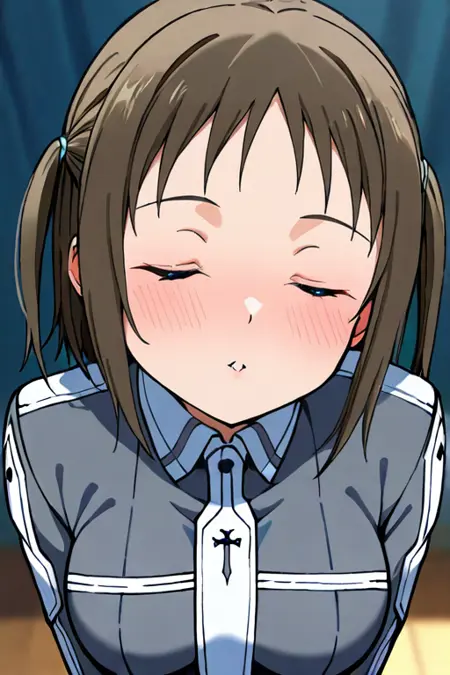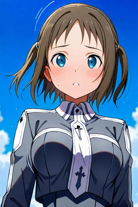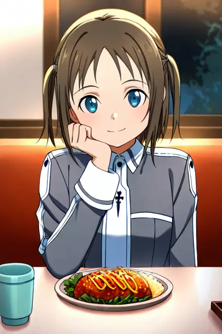 1소녀, 싱글, ronye_arabel_(sword_art_online), 짧은 머리, 갈색 머리, 양측 위로, 파란 눈,
