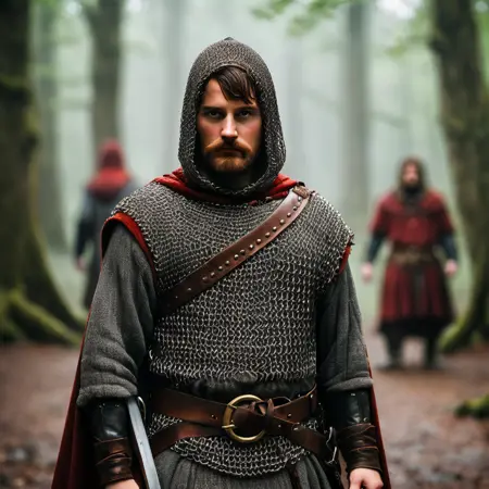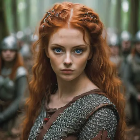 1boy, 1girl, bald, beard, belt, black hair, blonde hair, blue eyes, blurry, blurry background, boots, braid, breastplate, breasts, brown hair, brown pants, cape, chainmail, cleavage, closed mouth, dagger, dark skin, depth of field, facial hair, facial mark, fingerless gloves, freckles, full body, gauntlets, gloves, green eyes, helmet, holding, holding knife, holding sword, holding weapon, hood, jewelry, knife, lips, long hair, long sleeves, looking at viewer, looking to the side, male focus, medium breasts, mole, mustache, necklace, orange hair, own hands together, pauldrons, polearm, rain, realistic, red hair, ring, ring mail, robe, scabbard, scar, sheath, sheathed, shirt, short hair, shoulder armor, sitting, solo, solo focus, spear, staff, standing, strap, sunlight, sword, tattoo, twin braids, upper body, vambraces, wavy hair, weapon, yeoman