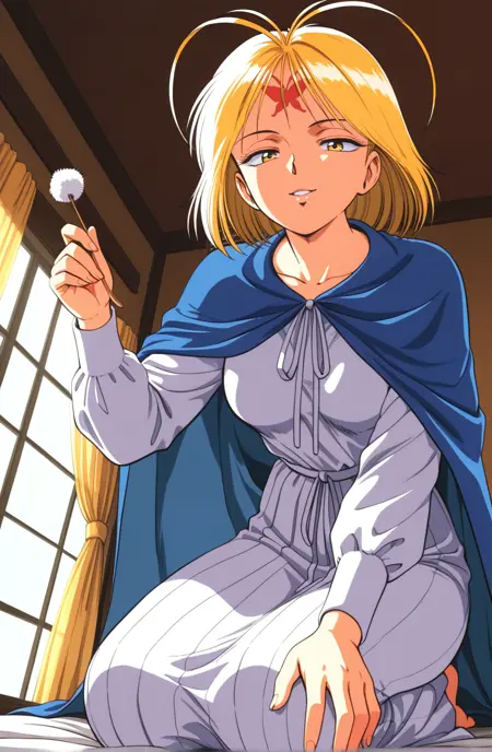 1girl,kznk1sidnpaf1o,retro artstyle,1990s \(style\),sanpaku,constricted pupils,yellow eyes, antenna hair,blonde hair, short hair,red_butterfly_forehead_mark,facial mark,medium breasts,blue cape,long sleeves,long skirt,white dress,outdoors,tree,looking at viewer, v-shaped eyebrows,smile,best quality,masterpiece,sensitive , lora:KazenokishidanPafioNoobAI2:1