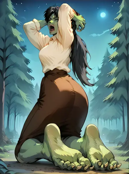 green skin, blue hair, solid orange eyes, dark green nipples, horns, sharp teeth, claws, very long hair