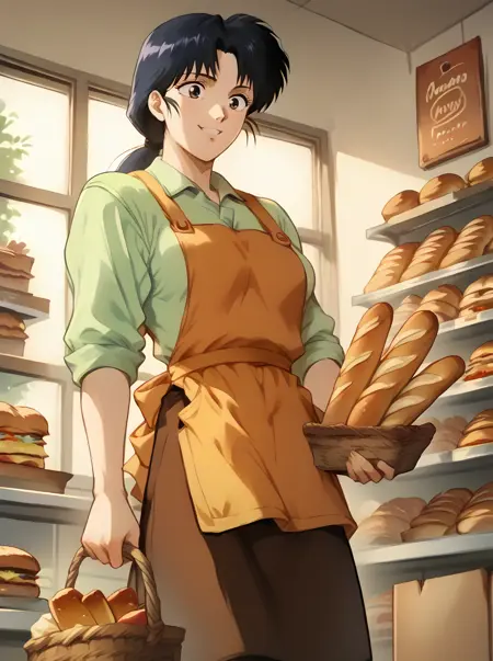 绿色上衣,卷起袖子,橙色围裙,马尾辫,棕色裙子
