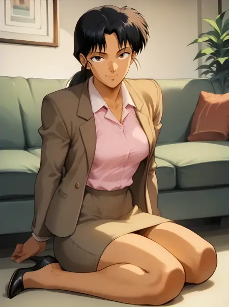 tan blazer, pink shirt, long hair, tan skirt, black high heels
