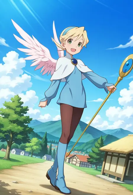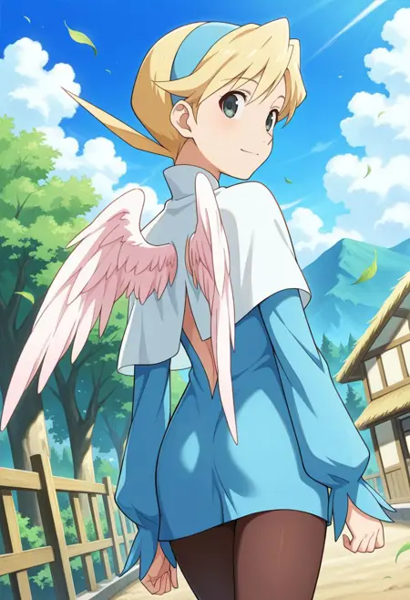 nina4def, blonde hair, short hair, green eyes, angel wings,