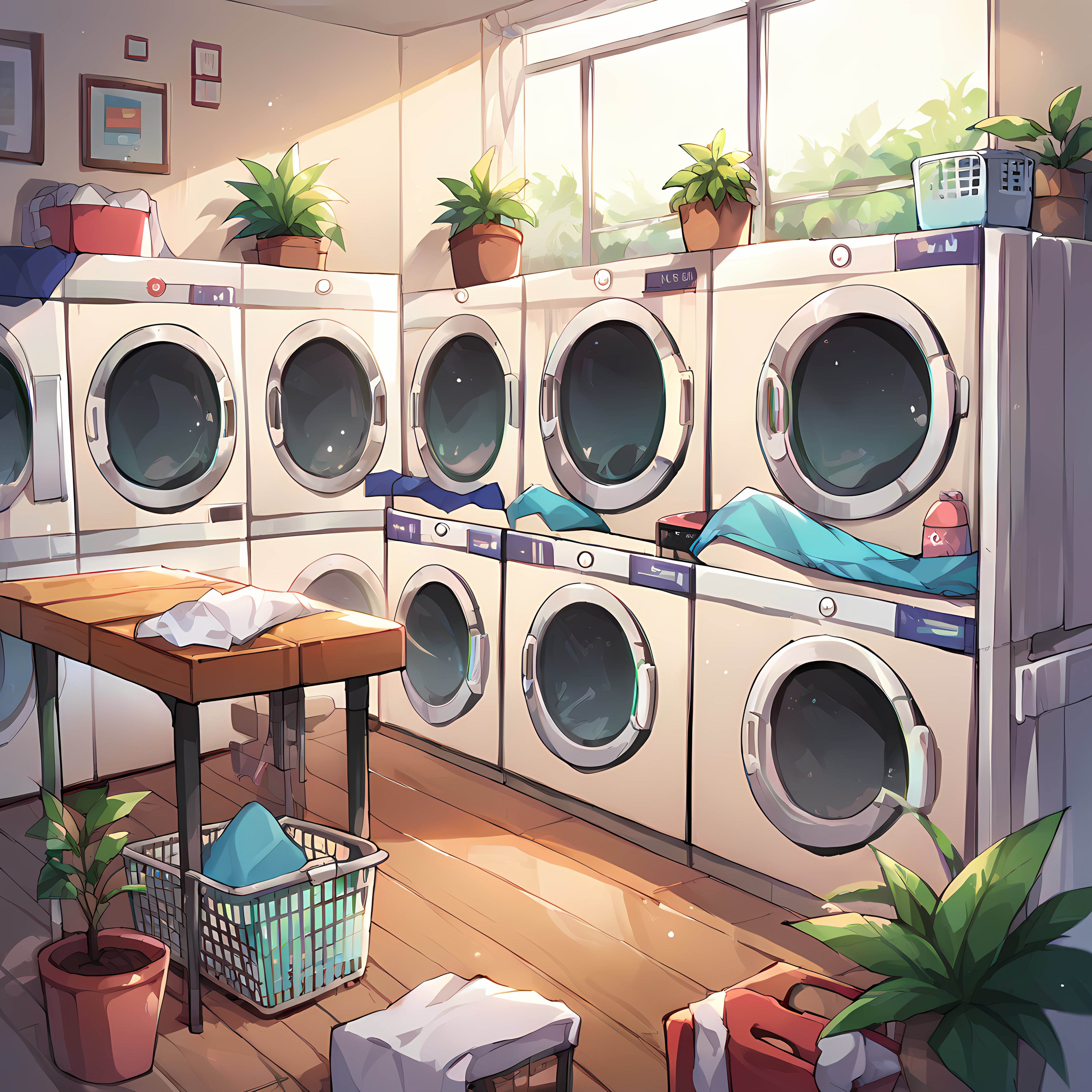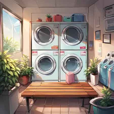 附加:洗衣店、室内、洗衣机、洗衣篮、长椅