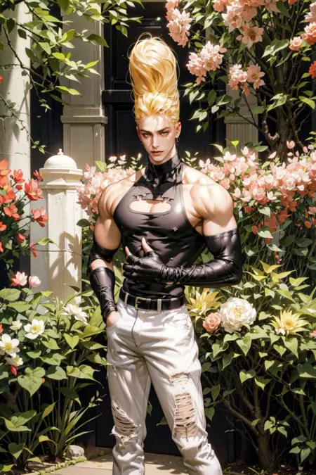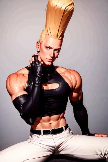 衣装: タンクトップ、胸元の切り替え、ベルト、白いズボン、指なしグローブ、金髪、尖った髪形、靴、イヤリング