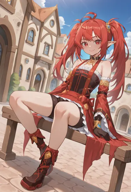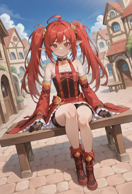 battlemage_neo,1girl,solo,red hair,long hair,ahoge,red eyes,twintails,pointy ears,red dress,detached sleeves,bare shoulders,frills,frilled sleeves,wide sleeves,black thighhighs,garter belt,boots,red footwear,black gloves,earrings,jewelry,hair ornament,(pink lips:0.8),