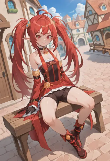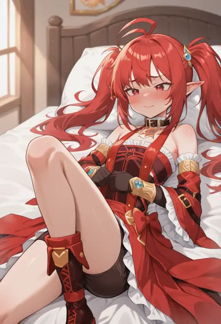red hair,long hair,ahoge,red eyes,twintails,pointy ears,