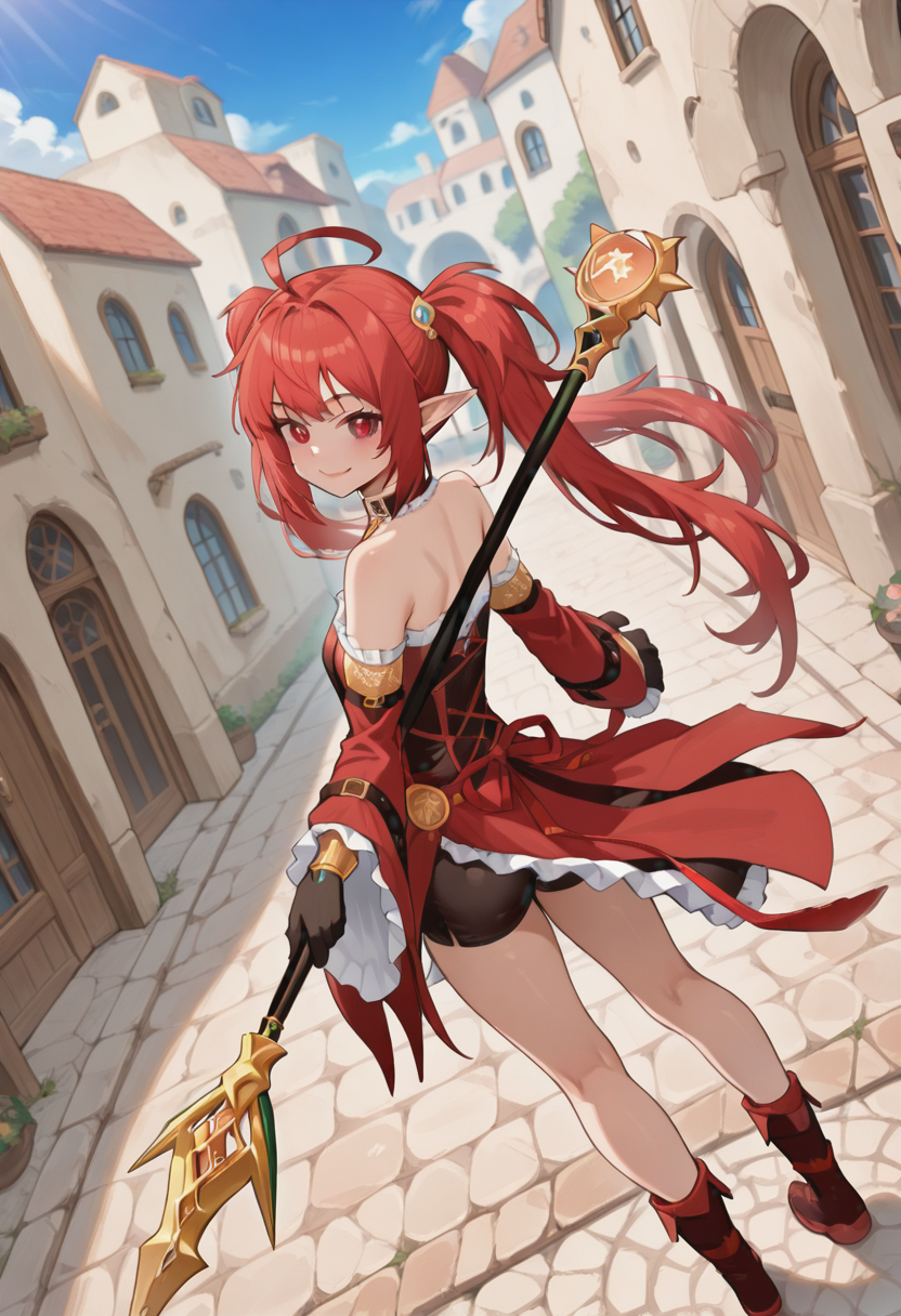 battlemage_ashtarte,1girl,solo,red hair,long hair,ahoge,red eyes,twintails,pointy ears,black shorts,shorts under skirt,detached sleeves,wide sleeves,bare shoulders,frills,frilled sleeves,boots,red footwear,black gloves,choker,jewelry,star (symbol),hair ornament,