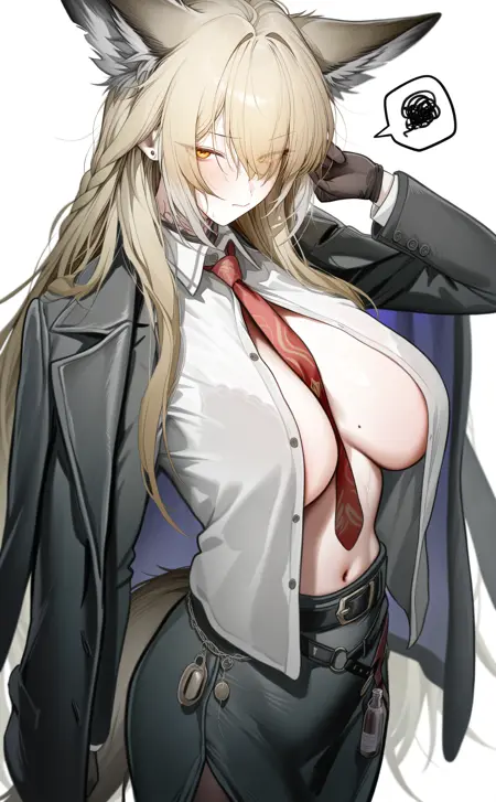 vulpisfoglia\(arknights\)、金髪、長髪、白髪、複色髪、狐の耳、動物の耳のふわふわ、狐の女の子、大きな胸、狐の尾