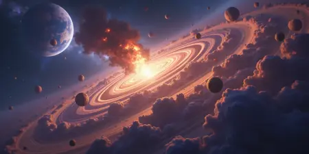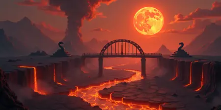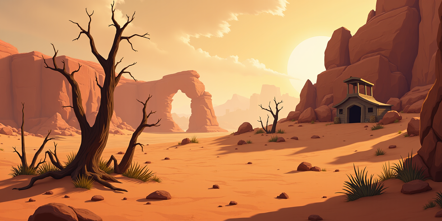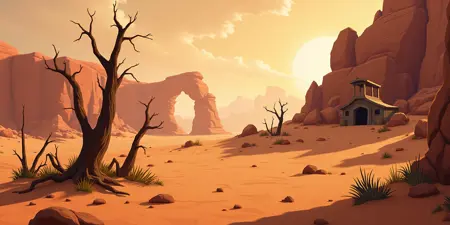 示例:The image depicts a desert landscape with a warm,orange-toned sky suggesting either sunrise or sunset. The foreground consists of sandy terrain with sparse vegetation,including a cactus and some small rocks. There are also a few twisted,dead trees scattered around. In the background,there are large rock formations with an archway leading to a more distant desert scene. A small structure,resembling a cave or cave entrance,is visible on the right side of the image. The overall atmosphere is serene and somewhat desolate,typical of a desert environment