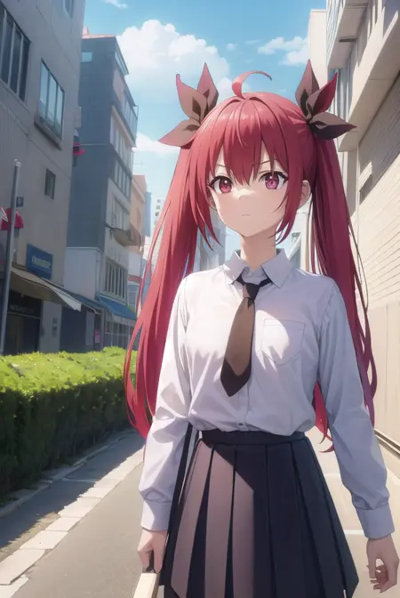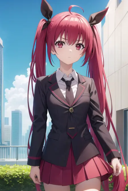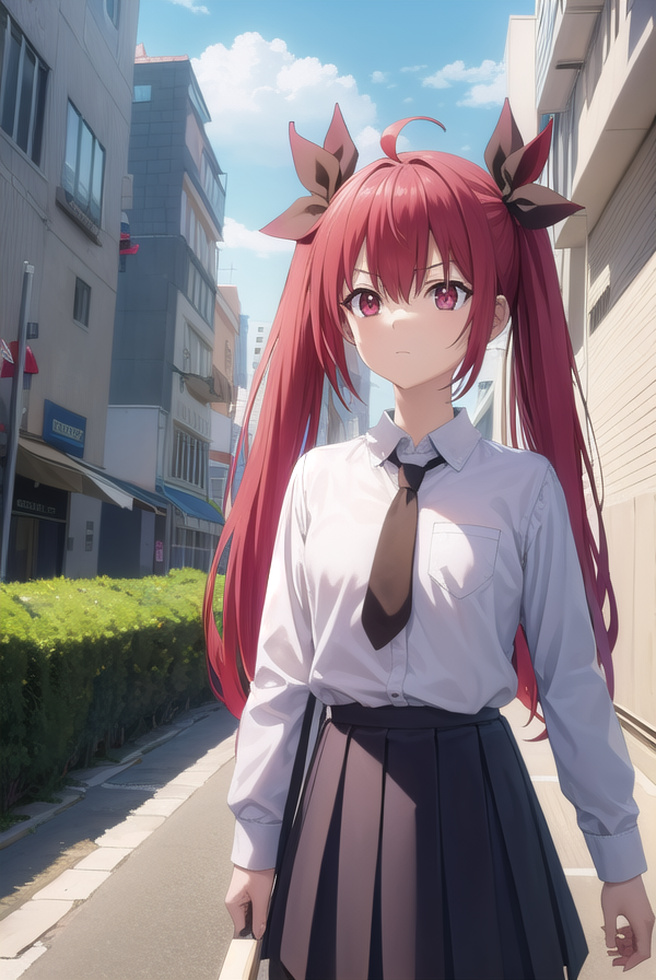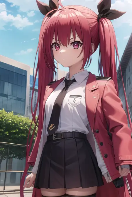 (어깨에 옷을 입음:1.7), (흰 셔츠:1.5), 코트, (빨간 코트:1.5), 칼라 셔츠, 긴 소매, 트윈테일, 머리 리본, 검은 리본, 넥타이, 학교 유니폼, 치마, 빨간 치마, 주름 치마, 허벅지까지 긴 양말, 검은 넥타이,