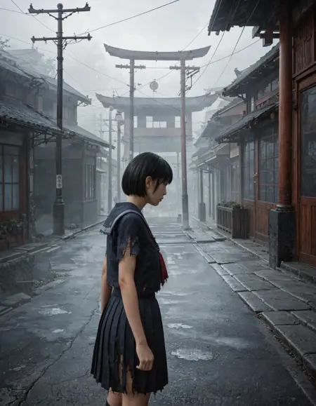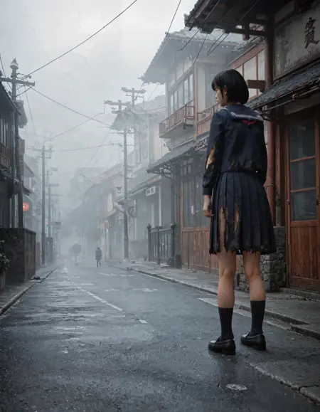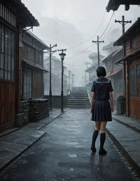 japanese street,japan,buildings,dark,fog,power lines,east asian architecture