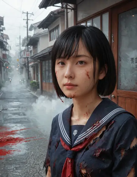 shi_ko, 1girl,solo,short hair,black hair,serafuku,school uniform,shirt,black socks,black loafers,bloody,torn clothes