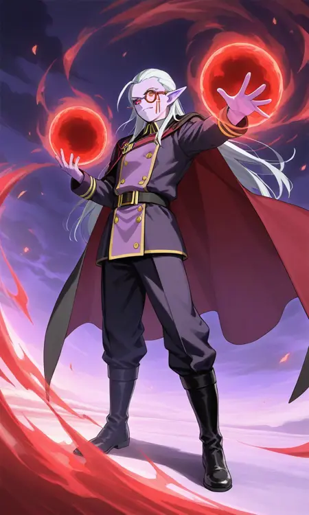 1boy, grey hair, straight hair, ahoge between eyes, purple skin, red face tattooes, red eyes, black and purple uniform, black pants, black boots, cape with red attaches, belt, red monocle with yellow glass