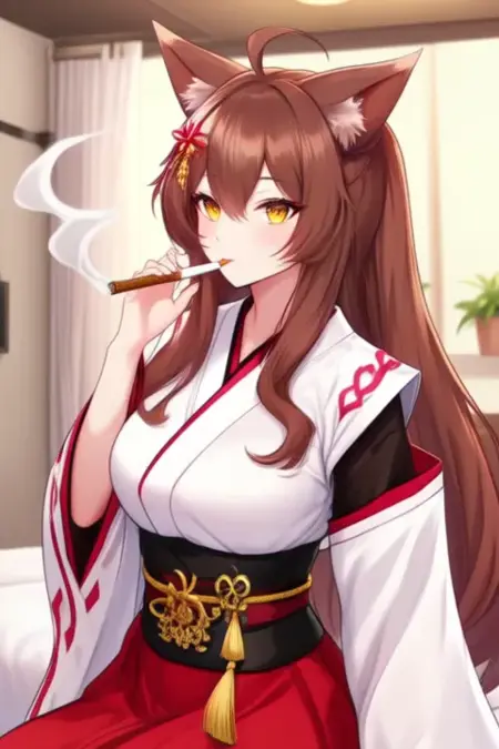 Trigger Word:Fumi, anime-style girl. The image features an anime-style character with long, flowing brown hair adorned with two buns tied with ribbons. The character has large, expressive yellow eyes. She is wearing a traditional Japanese outfit that includes a white blouse with red and black accents, a red skirt with gold trim, and a long red cape with black and gold details. The cape has tassels hanging from the ends