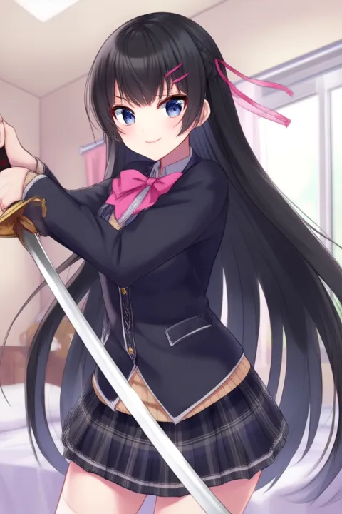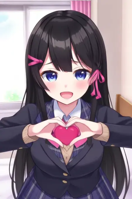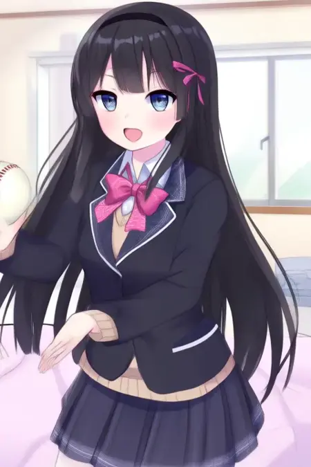 トリガー語: Tukino Mito、アニメスタイルの女の子。画像には、肩より長い真っ直ぐな黒髪のアニメスタイルのキャラクターが描かれています。前髪は額の一部を覆い、ピンクのリボンが結ばれたヘアバンドを着用しています。目は大きく青く、キャラクターに活気に満ちた表現力ある外観を与えています。キャラクターは、薄い色のシャツにピンクのボウタイを合わせ、その上に濃い色のブレザーを着た学校制服を身に着けています。シャツの衿にはチェックパターンが施されています。スカートは折りたたみ式で、ブレザーと同様に濃い色です。