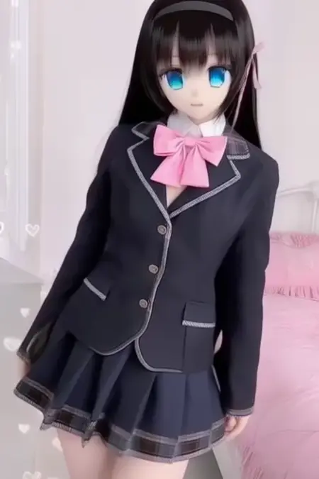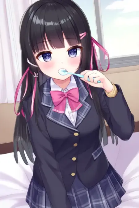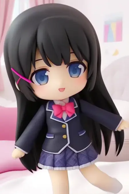 サンプルプロンプト: Tukino Mito、アニメスタイルの女の子。画像には、肩より長い真っ直ぐな黒髪のアニメスタイルのキャラクターが描かれています。前髪は額の一部を覆い、ピンクのリボンが結ばれたヘアバンドを着用しています。目は大きく青く、キャラクターに活気に満ちた表現力ある外観を与えています。キャラクターは、薄い色のシャツにピンクのボウタイを合わせ、その上に濃い色のブレザーを着た学校制服を身に着けています。シャツの衿にはチェックパターンが施されています。スカートは折りたたみ式で、ブレザーと同様に濃い色です、(彼女は踊っている:2.5)、(ちびネンドロイド:3.5)寝室で。