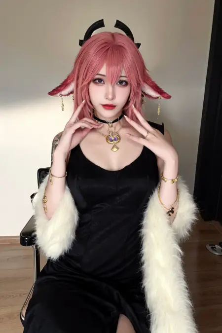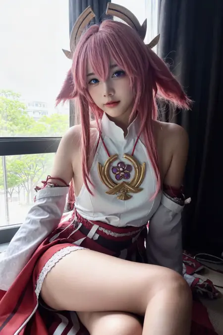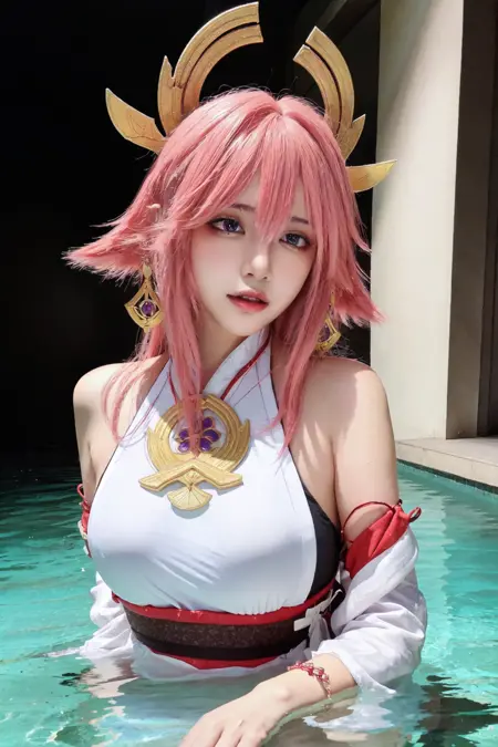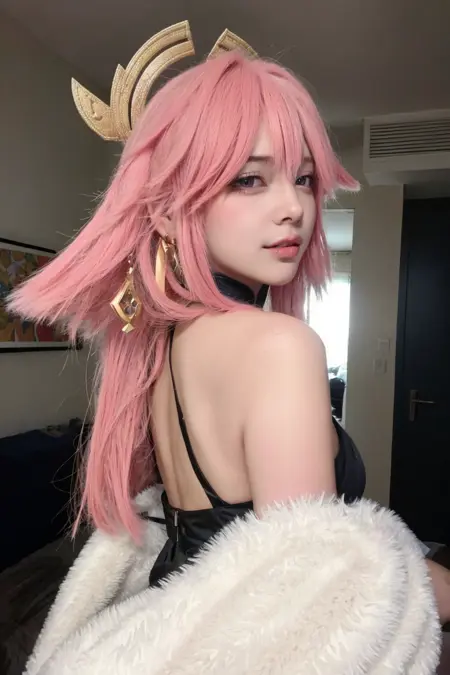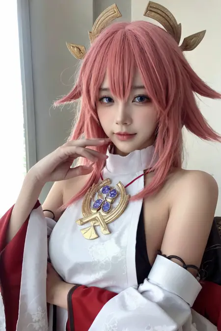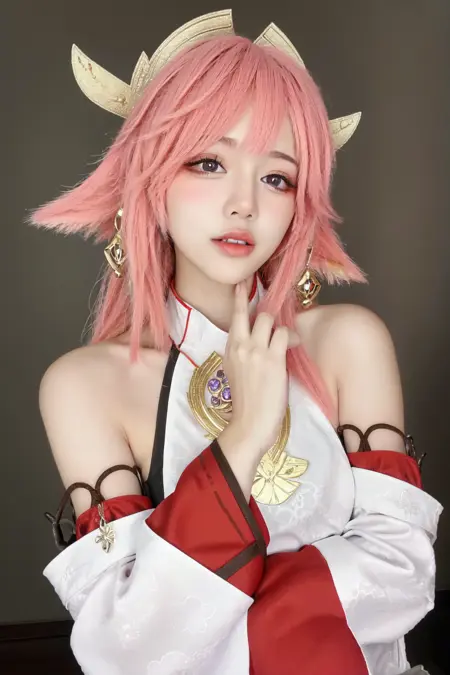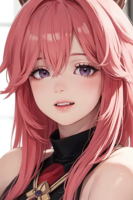 yae miko,1girl,pink hair,solo,long hair,purple eyes,looking at viewer,animal ears,bangs,jewelry,fox ears,hair between eyes,earrings,hair ornament,