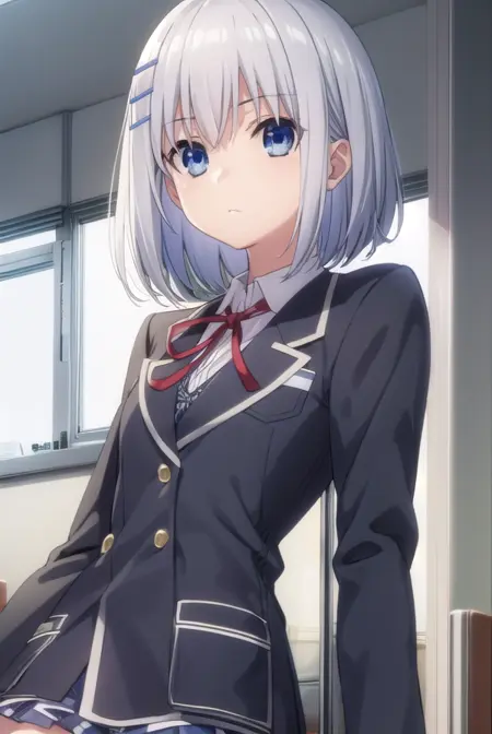 origami tobiichi, 파란 눈, 긴 머리, 학교 유니폼, 흰 머리, 헤어 클립, 헤어 핀,