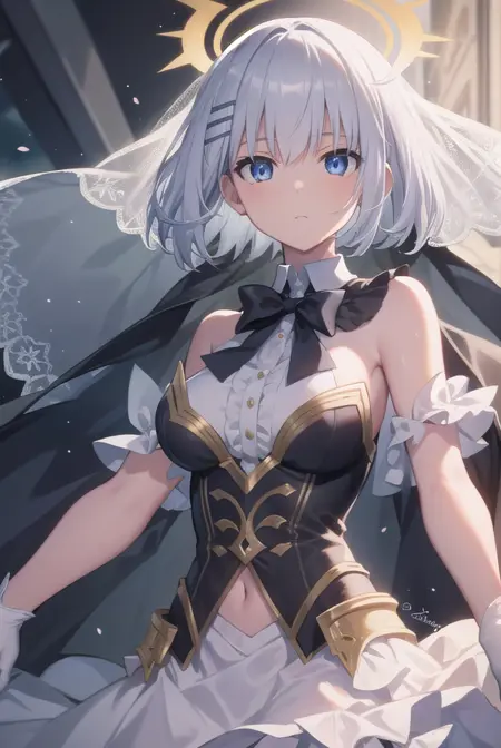 肘套,荷叶边裙,荷叶边,手套,肚脐,裙子,白手套,白裙,光环,婚纱面纱,面纱,