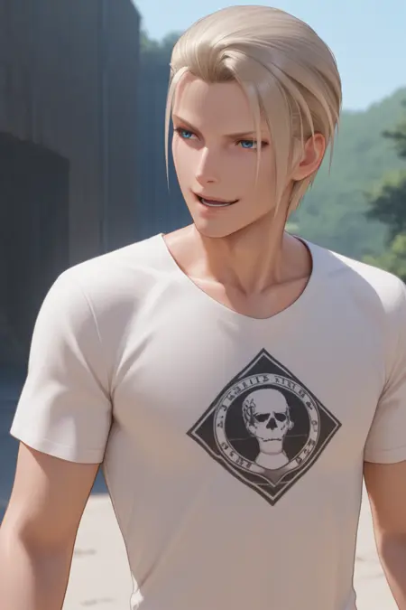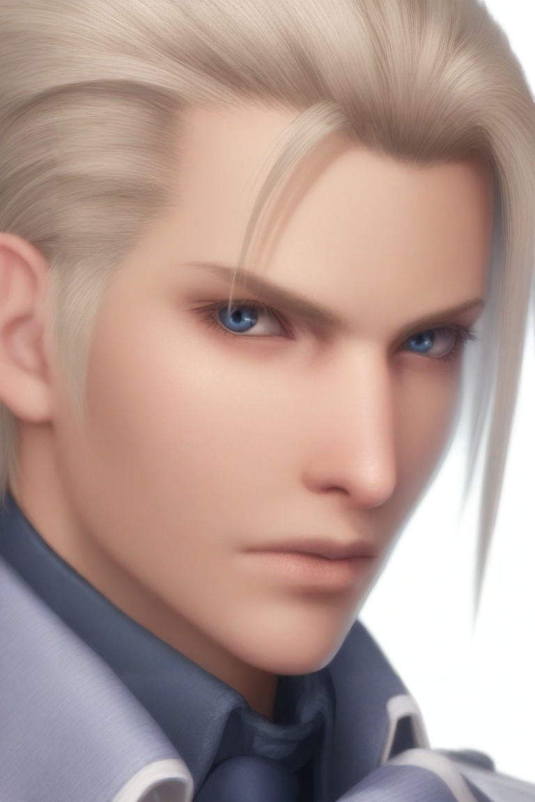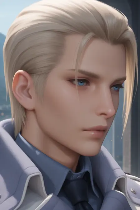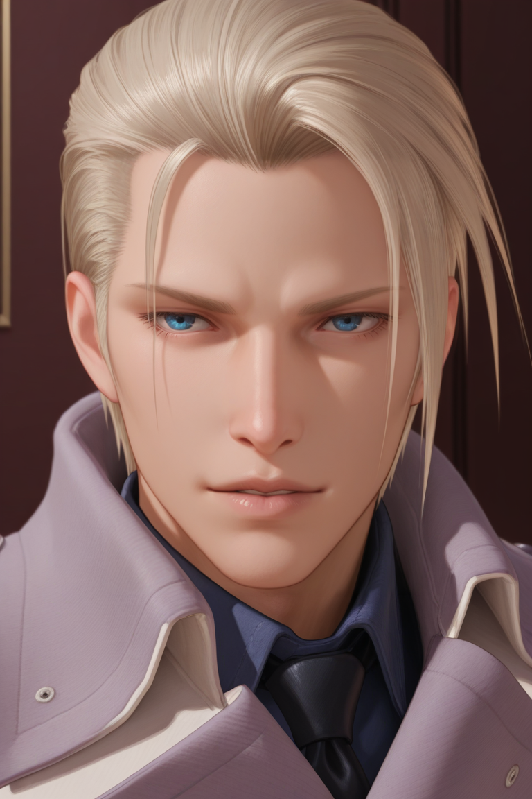 rufus shinra,platinum blonde hair,blue eyes,short hair,slicked back hair
