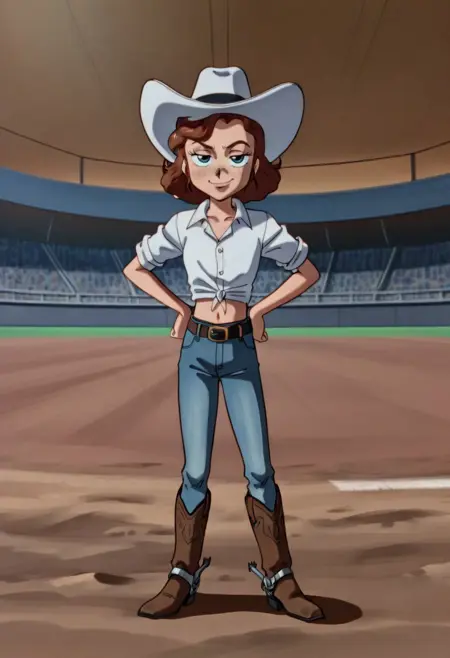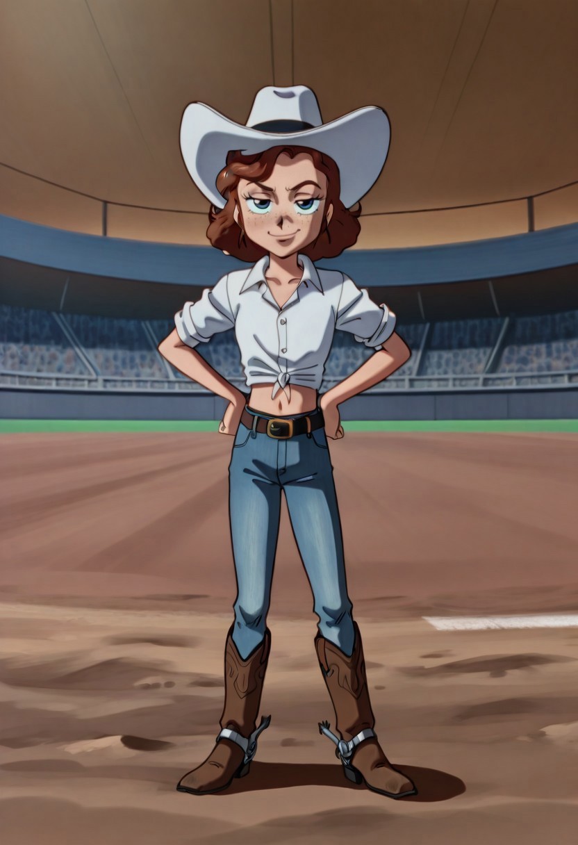 莎莉: SBS_JN,蓝眼睛,牛仔帽,白色头饰,棕色头发,不对称刘海,中长发,雀斑,痣,有领衬衫,白衬衫,扣子衬衫,系扣衬衫,露脐,腰带,腰带扣,牛仔裤,蓝色牛仔裤,牛仔靴,马刺,指甲油
