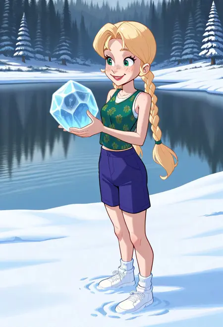埃尔克: EE_JN,绿眼睛,金色头发,鬓角,中分刘海,双马尾,极长发,口红,雀斑,痣,层叠衬衫,印花衬衫,绿色衬衫,无袖衬衫,白色背心,露脐,短裤,蓝色短裤,鞋子,白色袜子,白色鞋履