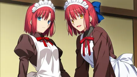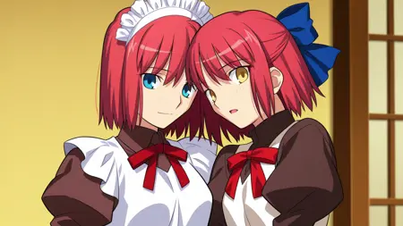(hisui (tsukihime), blue eyes, red hair, short hair, bob cut, maid headdress, neck ribbon, red ribbon, juliet sleeves, twins, sisters, maid, maid apron, collared dress),