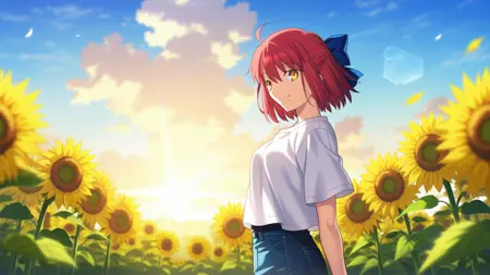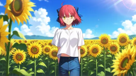 blue sky, sky, daylight, sunlight, depth of field, outdoors, blurry background, blurry foreground, cloud, field, flower, flower field, denim, jeans, pants, blue pants, shirt, white shirt, t-shirt, happy, smile, sunflower, sunflower field, yellow flower, lens flare, casual,