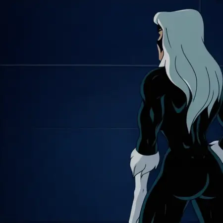 felicia hardy, long white hair, blue eyes, big breasts, athletic curvy toned sexy body, domino mask, choker,Slim, extraordinary beautiful woman, attractive woman,